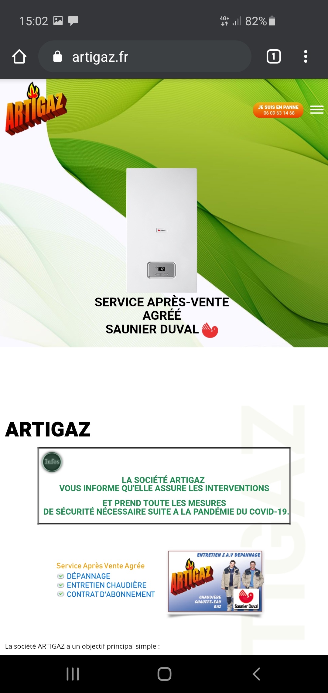 Suite à un problème de chaudière (retour de vacances) avec absence d'eau chaude et de chauffage, la personne d'Artigaz nous a dépanné au téléphone en prenant 5 minutes pour nous expliquer des manipulations à faire afin de résoudre notre problème. C'est toujours agréable de voir que des personnes sont à notre écoute quand on est en difficulté. Je recommande pour ceux qui souhaite une personne disponible et agréable sur la Salvetat saint gilles et les environs.